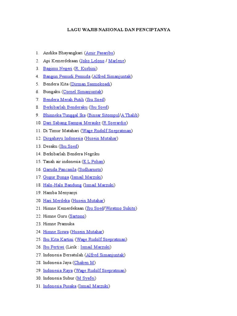 50 Judul Lagu Wajib Nasional Pencipta Liriknya Jalantikus - Berikut ini adalah daftar 17 lagu wajib nasional dan penciptanya.