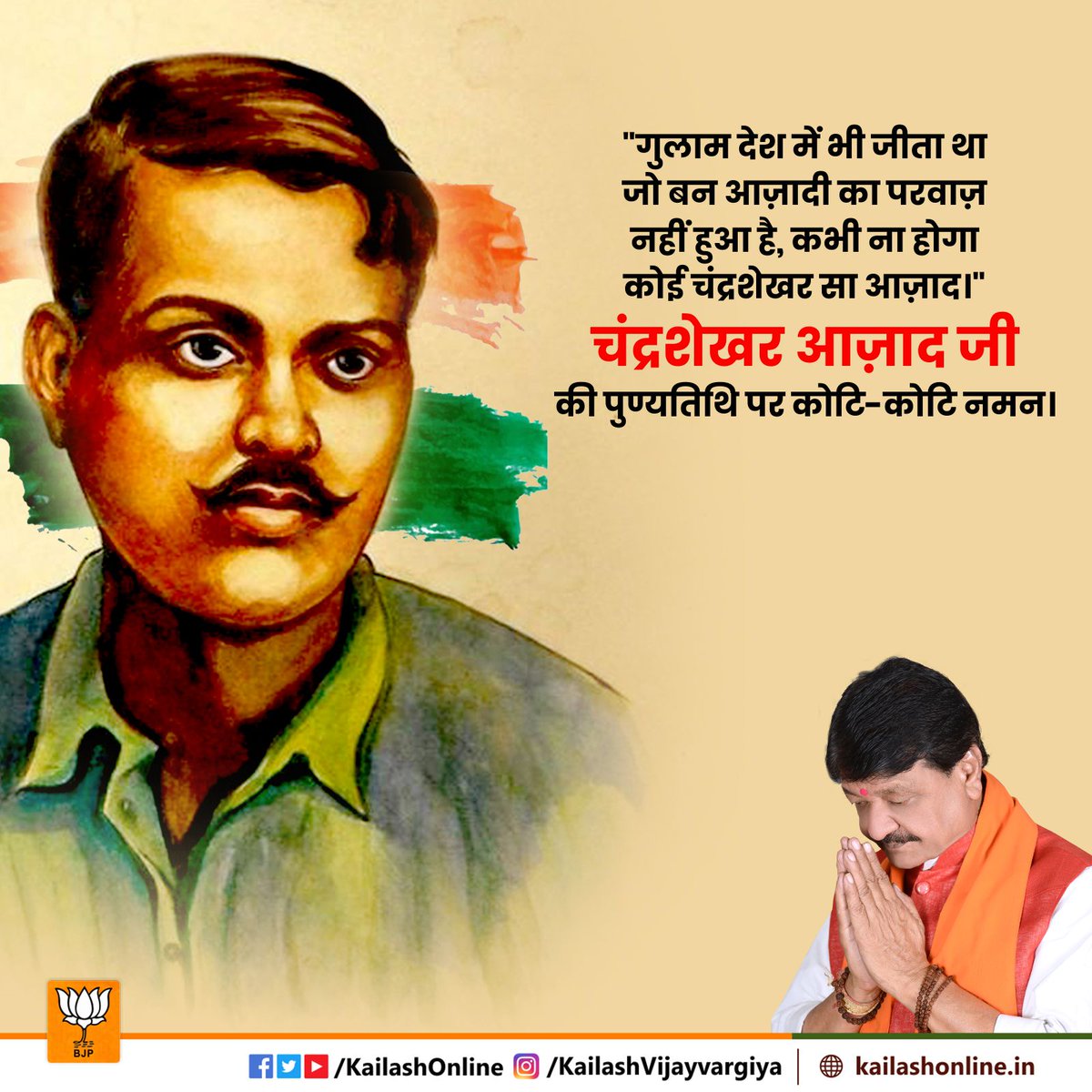 Haryana Bjp On Twitter न र भ क क र त क र अमर शह द श र च द रश खर आज द ज क प ण यत थ पर उन ह क ट क ट नमन Chandrasekharazad Mlkhattar Subhashbrala Sureshbhattbjp - यह चंद्रशेखर आज़ाद का जन्म दिवस है। आजाद का प्रारम्भिक जीवन आदिवासी बाहुल्य क्षेत्र में स्थित भाबरा गाँव में बीता। aazaad jayantee ya chandrashekhar aazaad jayantee pratyek varsh 23 julaee ko poore bhaarat mein manaayee jaatee hai.