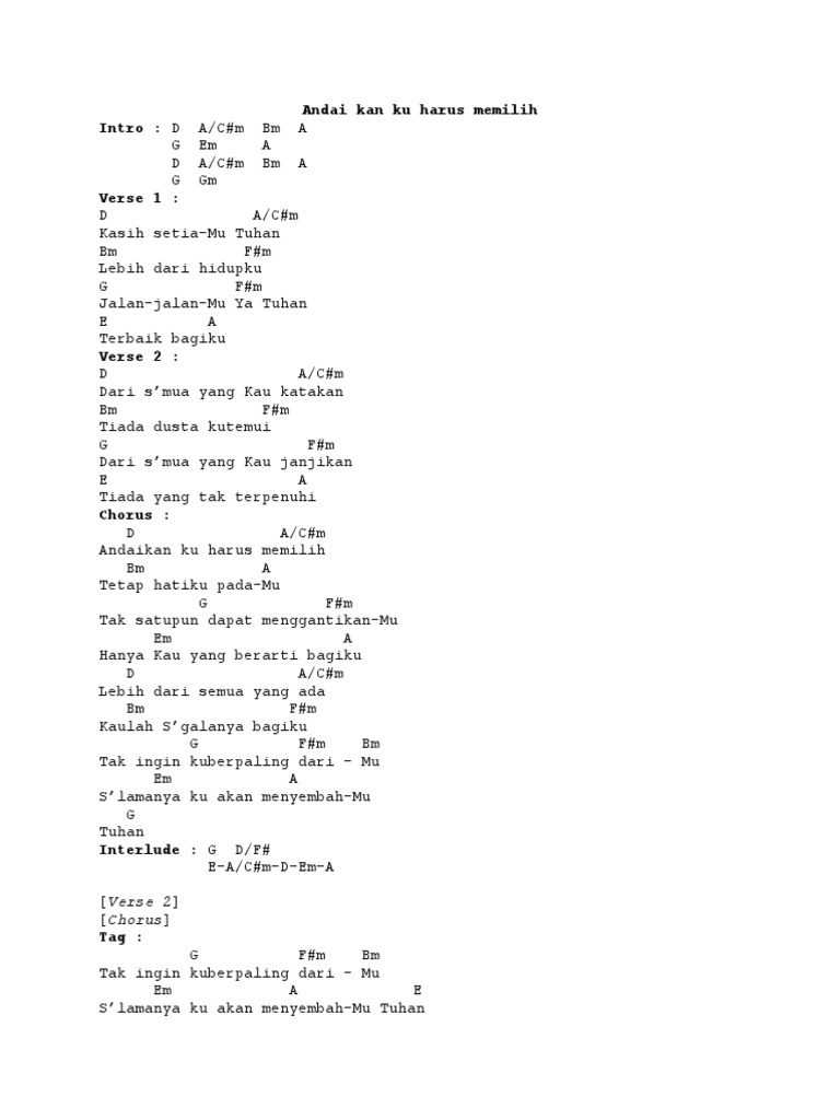 Chord Lagu Indonesia Terbaik Doc - chorus d bila ku harus memilih e a antara hidup dan mati f#m bm seperti aku memilih e a denganmu atau ku pergi d haruskah aku terluka e d c#m untuk kesekian kalinya f#m bm tuhan cukup cukup sudah e f#m aku pun ingi bahagaia f#m e d e.ohhh.