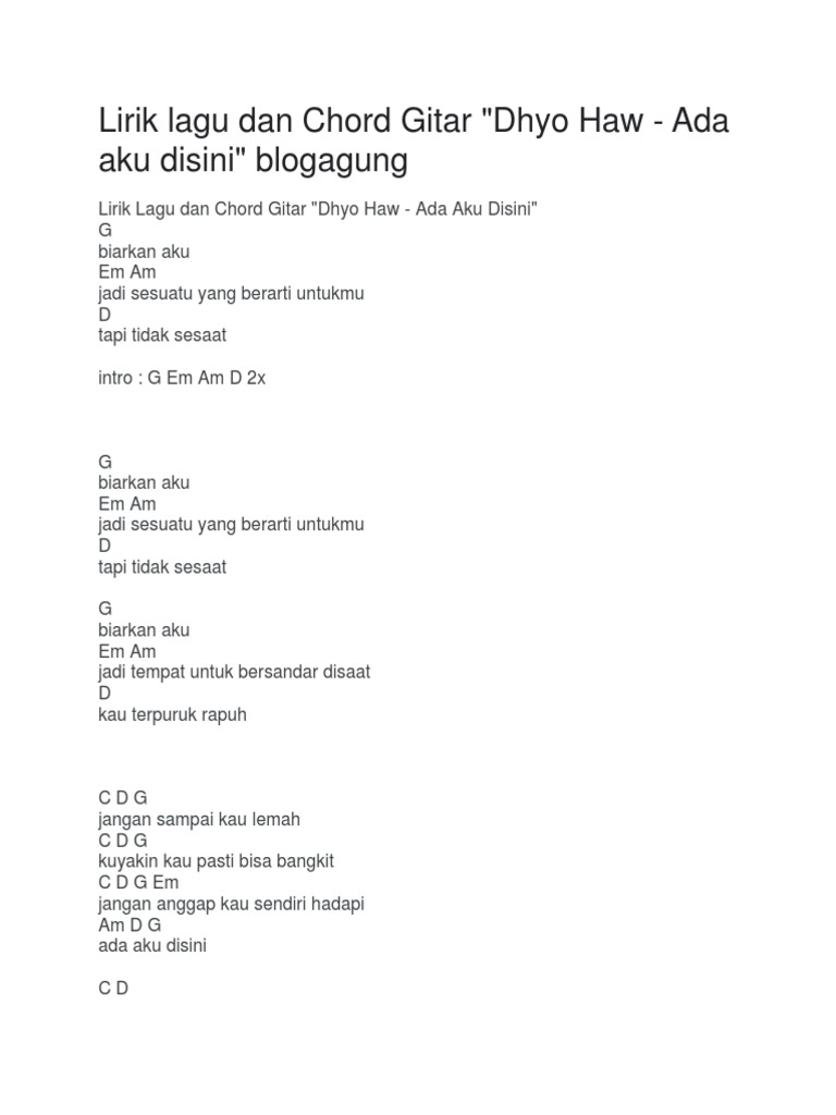 Dhyo Haw Ada Aku Disini Chord G : C d jangan ingat lagi jangan kau sesali. Dhyo Haw Ada Aku Disini Chord G / C d g jangan sampai kau lemah c d g kuyakin kau pasti bisa bangkit c d g em jangan anggap kau sendiri hadapi am d g.