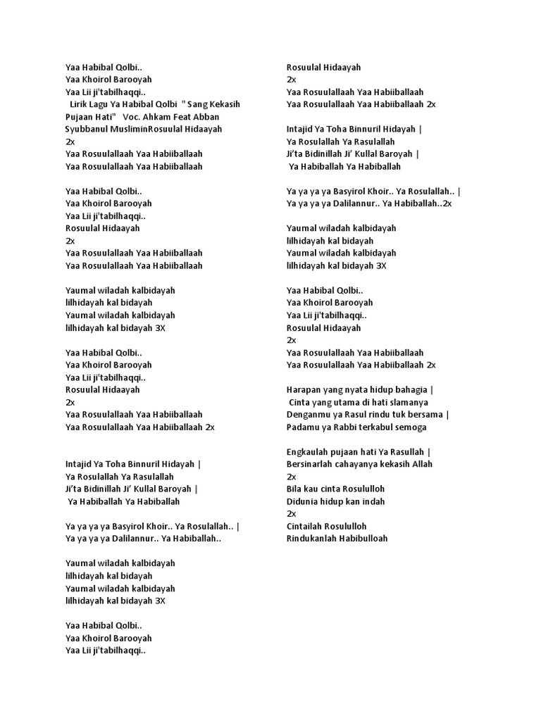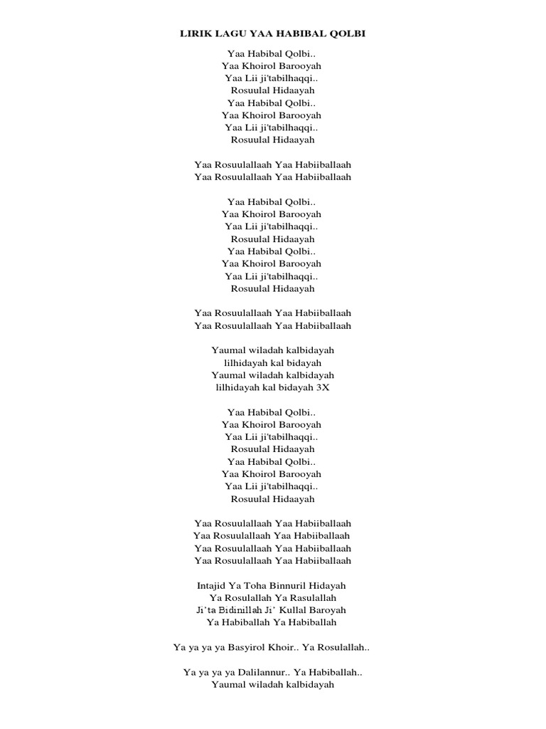 Lirik Lagu Ya Habibal Qolbi Indonesia / Lirik ya habibal qolbi oleh sabyan gambus. Lirik Lagu Ya Habibal Qolbi Indonesia - Lirik lagu sholawat ya habibal qolbi versi sabyan gambus.