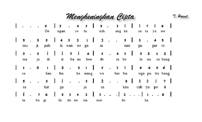 Not Angka Dan Not Balok Lagu Mengheningkan Cipta Koleksi Not Angka - Lagu mengheningkan cipta ini ciptaan t prawit, birama 4/4, dengan dinamika largissimo biasanya dibawakan untuk latar belakang acara mengheningkan cipta saat upacara bendera.