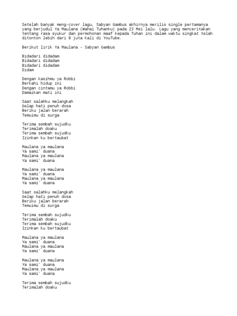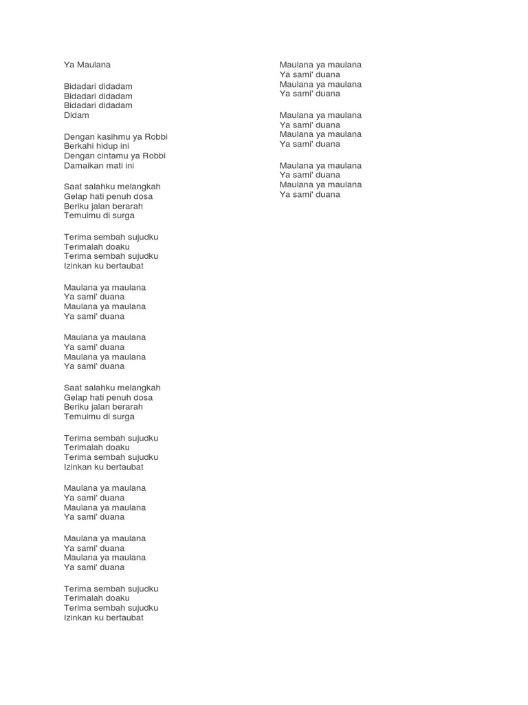 Teks Maulana Ya Maulana Ya Sami Duana / Izinkan ku bertaubatmaulana ya maulana. Teks Maulana Ya Maulana Ya Sami Duana : Saat salahku melangkah gelap hati penuh dosa beriku jalan berarah temuimu di surga.